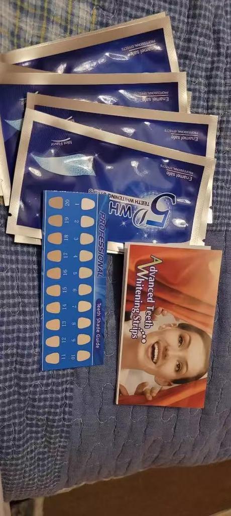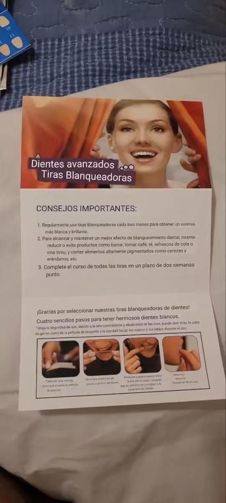 I love this product. I hadn't written a review because I needed to try it first, and from the very first application, you can feel and see that your teeth are whiter. Of course, I take care of my teeth, so I use it as an aid for whitening... I really recommend them; you'll love the results, and they have a pleasant taste. They're easy to apply, and my order arrived super quickly. Thank you