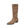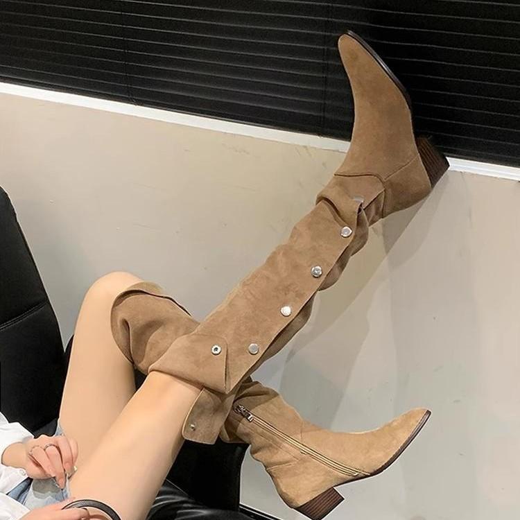 Cowhide~ Vintage Maillard Pointed Pile Boots Women's Western Cowboy Boots Button High Boots Thick Heel Boots Autumn