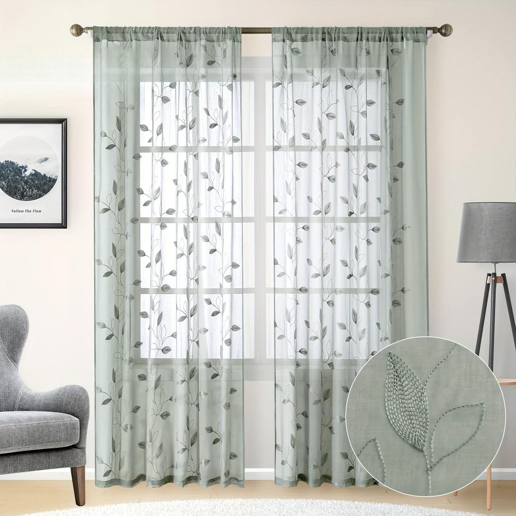 1pc Garden Style Embroidered Leaf Pattern Sheer Curtains, Rod Pocket Polyester Drapes for Bedroom, Living Room, Kitchen - Machine Washable