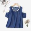 VONDA Summer Women Casual O-neck Cold Shoulder Lace Beading Short Sleeve Blouse