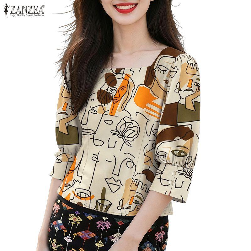 ZANZEA Women Square Collar Casual 3/4 Sleeve Loose Print Blouse