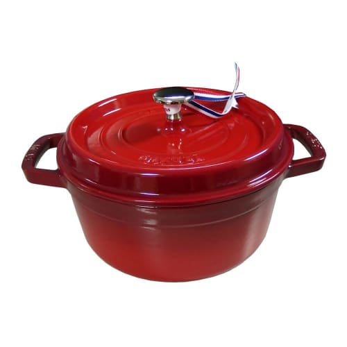 - Item: Pico Cocotte Round 22cm, Color: Cherry/Red, Size: Diameter: 22cm / Width (including handle): 28.5cm / Depth: Approx. 10cm / Height (including lid): 15cm, Capacity: 2.6L, Material: Enamel