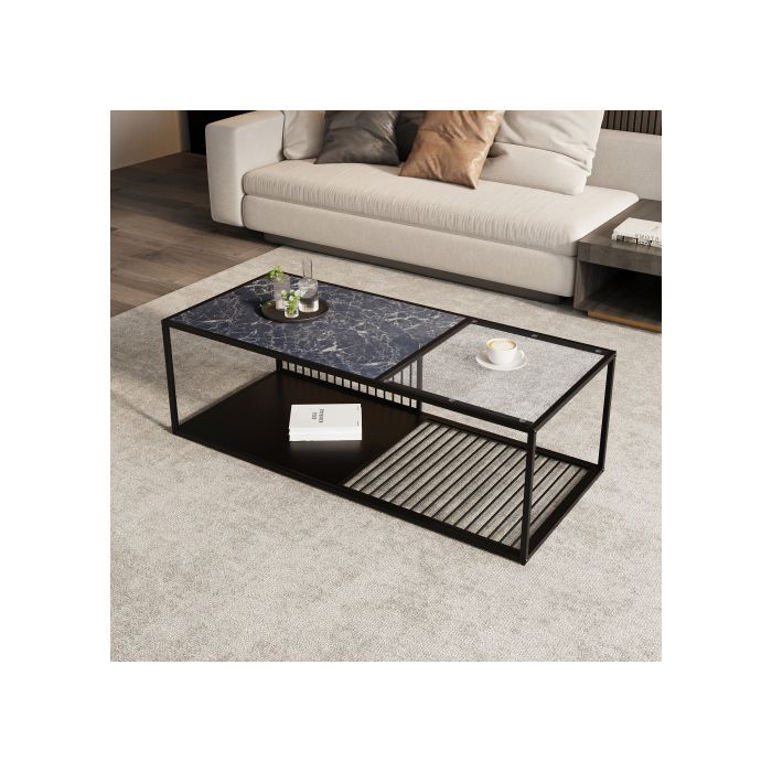 Table Basse - MUVOE - Fer Forgé - Verre Trempé - Rangement Intégré - Design Contemporain