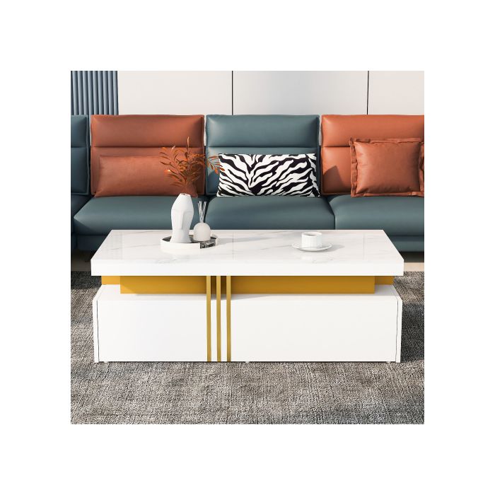 Table Basse Moderne Rectangulaire, Brillante, Avec 2 Tiroirs En Bois, Plateau En Marbre, 100*50*40 Cm