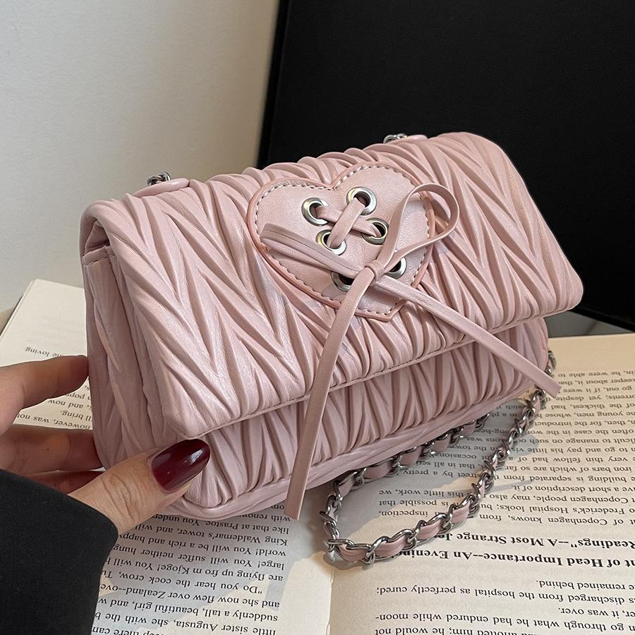 - **Structured Design Details**: Features a stylish mini crossbody bag silhouette with PU material, textured pleated finish, a heart-shaped hardware accent, and a delicate bow detail. It supports a crossbody carrying method with an adjustable 118cm chain strap. It exudes sweet and feminine charm, perfect for adding a romantic touch to any outfit.