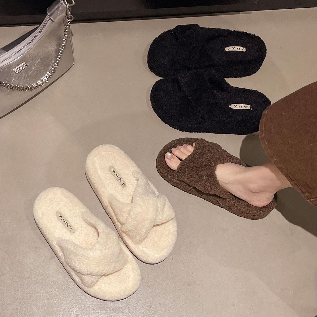 Round Head Thick-soled Fluffy Slippers Women's Outer Wear 2025 Autumn and Winter New Cotton Slippers Fashionable Solid Color One-word Slippers