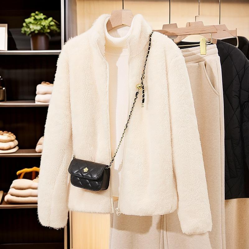 Lazy Wind Loose Zipper Fleece Jacket Women's Autumn and Winter Thickened Warm Stand-up Neck Cardigan Sweater Tide