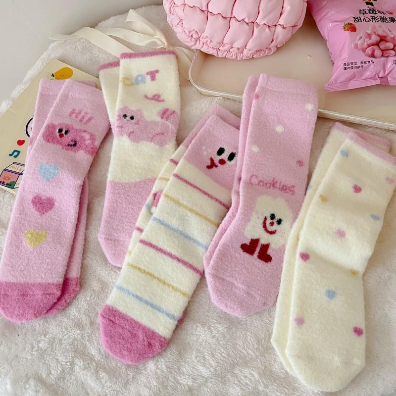 Plush Socks, Thick and Warm Mid-calf Socks for Autumn and Winter, Cute Cartoon Pink, Winter Home Furry Sleeping Socks