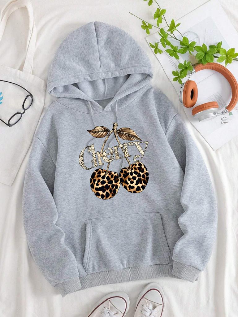Leopard Cherry Creative Printing Hoodies Women Fleece All-Match Streetwear Y2K Pocket Hoody Autumn Casual Woman Clothing
