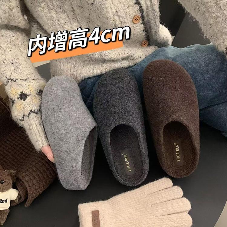 Grey Woolen Retro Inner Height Increase 4cm Boken Shoes Women's Thick-soled Small Potatoes Plush Warm Bag Head Fluffy Slippers