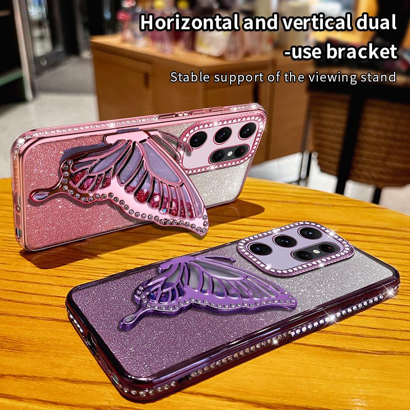 Diamond Glitter Liquid Quicksand Butterfly Phone Holder Case for Samsung Galaxy S25 S24 S23 S22 S21 S20 Ultra FE Plus Cover
