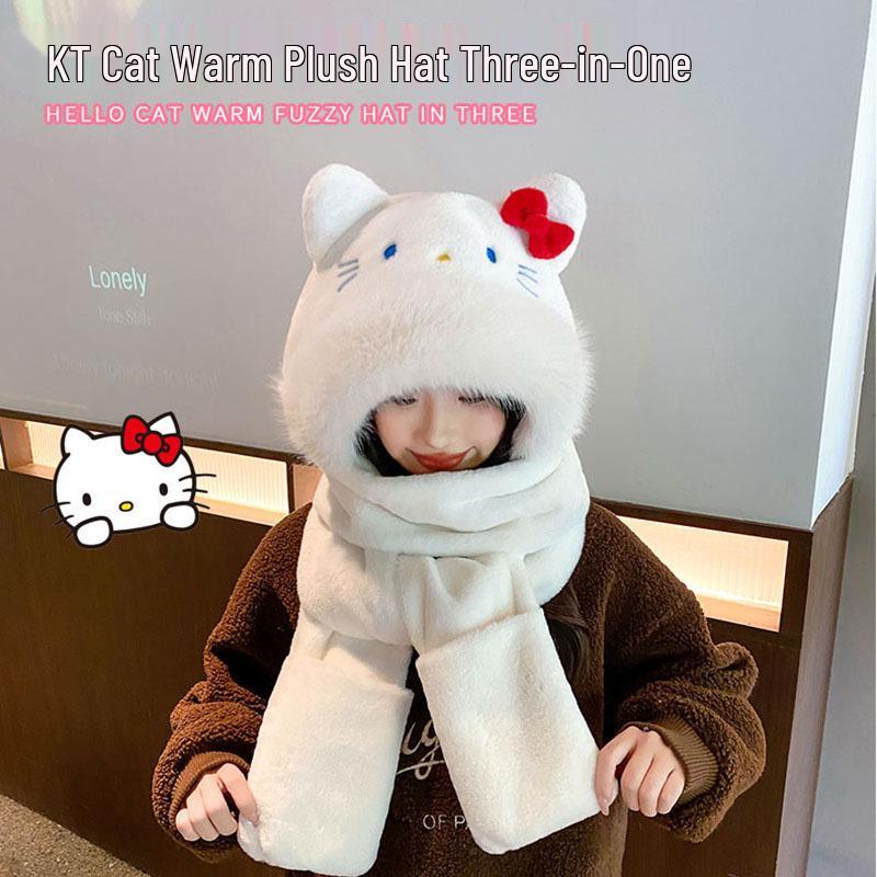 KT Cat Ears Plush Three-in-One Winter Set: Warm Hooded Scarf, Hat, and Gloves