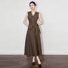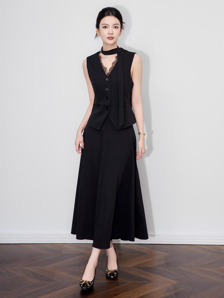 Introducing a sophisticated ensemble perfect for the autumn season, featuring a V-neck vest paired with a midi skirt. This set boasts a solid pattern highlighted by exquisite lace decoration, adding a touch of elegance to its sporty style. Crafted from comfortable polyester, it combines a twill fashion fabric finish for a modern look. This versatile set seamlessly blends style and comfort, making it an ideal choice for various occasions.