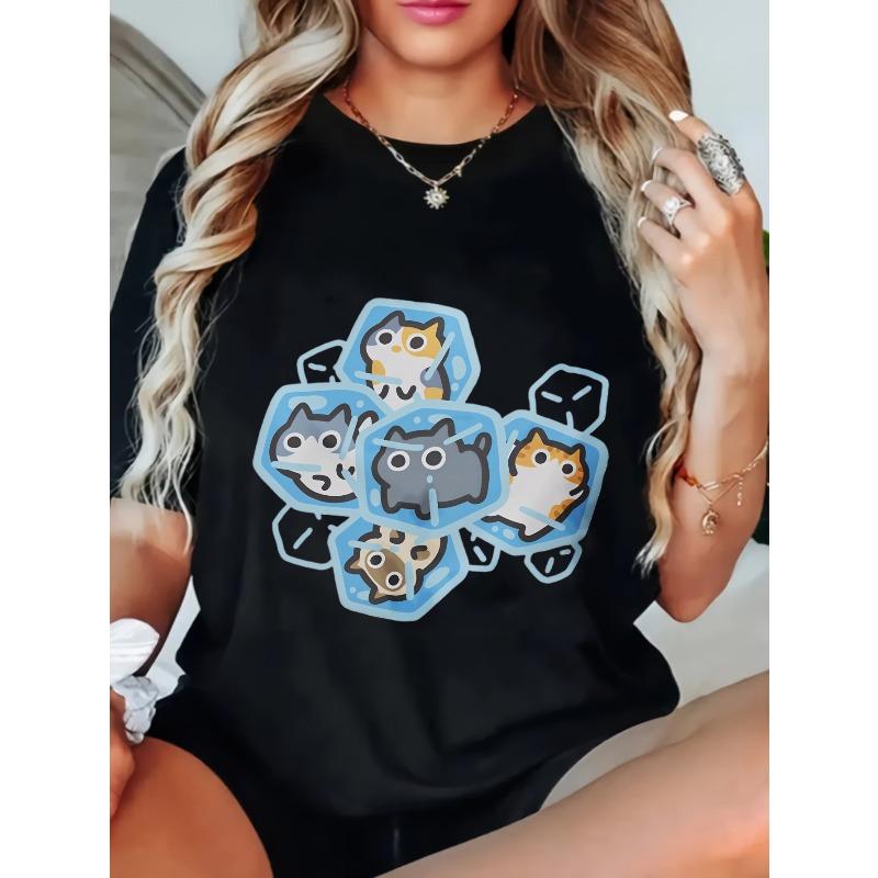 Cute Cat Print T Shirt Black Cartoon Cats Design Casual Wear for Women Everyday Outfits Summer Fashion Top Comfortable Loose Fit Style