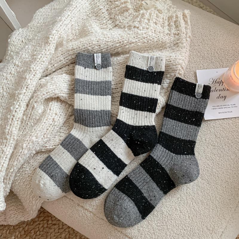 Ladies Autumn Winter Thickened Warm Trend Yarn Button Stripe Cloth Logo Vertical Stripe Wool Medium Tube Pile Socks