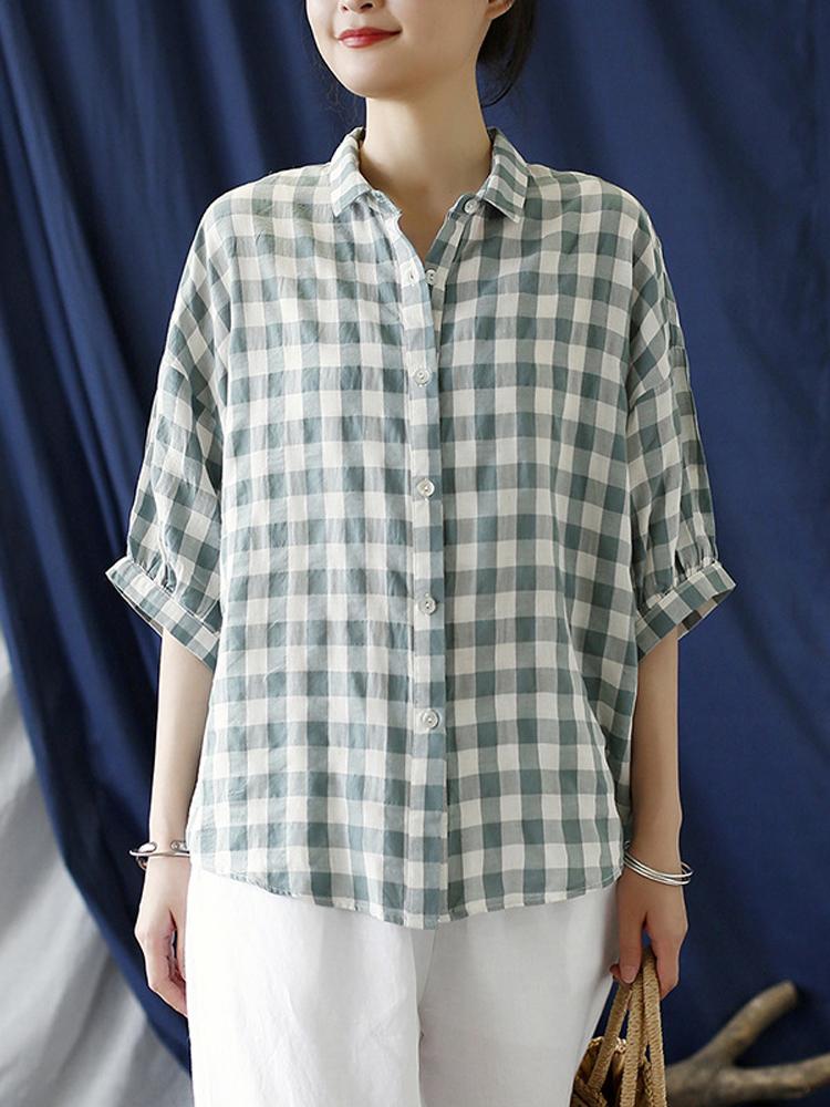 Johnature Women Plaid Shirts Tops Casual Half Sleeve Turn-down Collar Blouses Autumn Loose Shirts