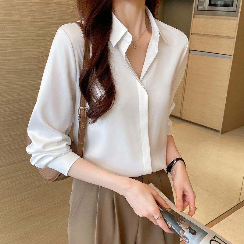 Introducing an elegant and high-end professional shirt designed for women, perfect for both spring and autumn. Crafted from luxurious satin, this shirt exudes sophistication with its smooth texture and lustrous finish. The solid pattern adds a timeless touch, making it suitable for various professional settings. Featuring long sleeves and a round neckline, this shirt combines classic design with modern elegance, ensuring you look polished and refined in any environment.