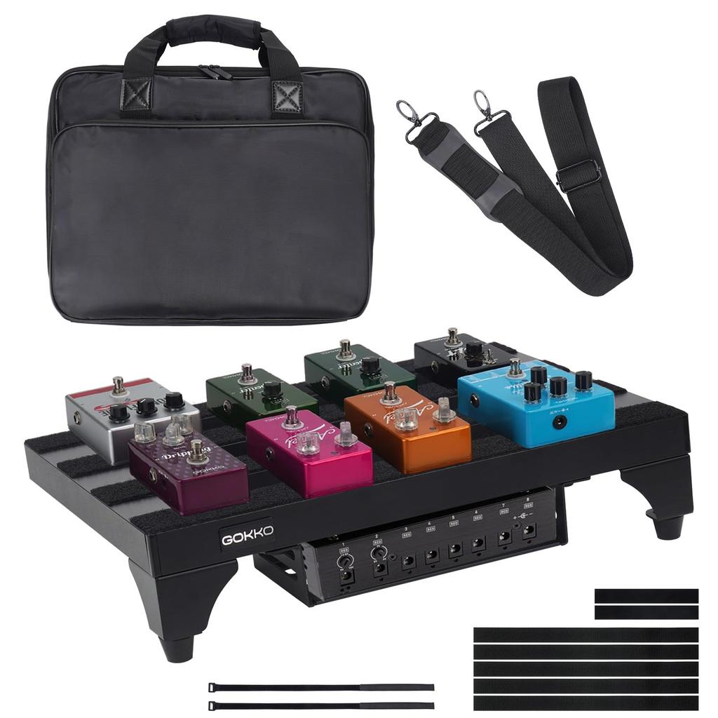 Ultra-Lightweight Guitar Effects Pedal Board: The GOKKO 2024 Advanced Guitar Effects Pedal Board is crafted from ultra-lightweight aluminum alloy for a robust construction and long-lasting performance. Package includes: pedal board, bag, Velcro strap, and power buckle. Board size: 35 x 27 x 8cm; weight: only 0.9kg. The medium-sized guitar effects board can accommodate up to eight standard pedals.
