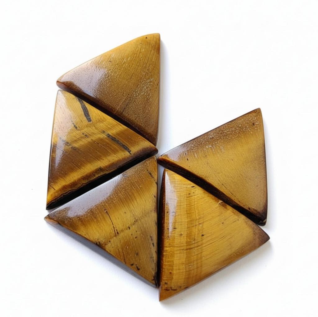 These striking Golden-Brown Tiger Eye Cabochons are cut into a contemporary triangle shape, perfect for unique jewelry designs. The polished surface highlights the stone's mesmerizing chatoyancy, where bands of light appear to shift and glide across the rich, striated golden-brown backdrop. This optical effect makes each stone visually dynamic and captivating, ideal for sophisticated, eye-catching pendants or statement rings.