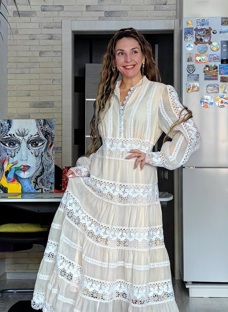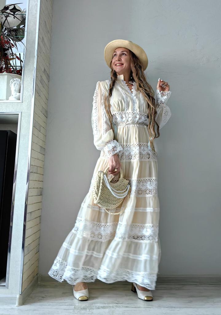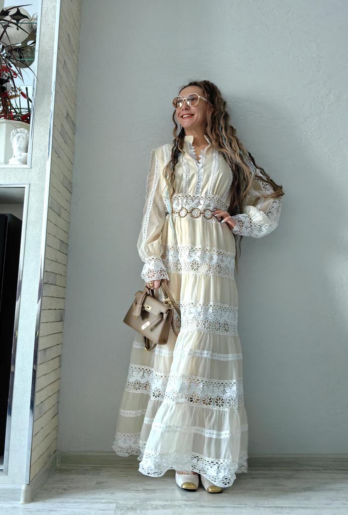 Luxury Designer Autumn Hollow Out Embroidery Prom Evening Dresses For Women Lace Patchwork V-Neck Long Lantern Sleeve Maxi Robe