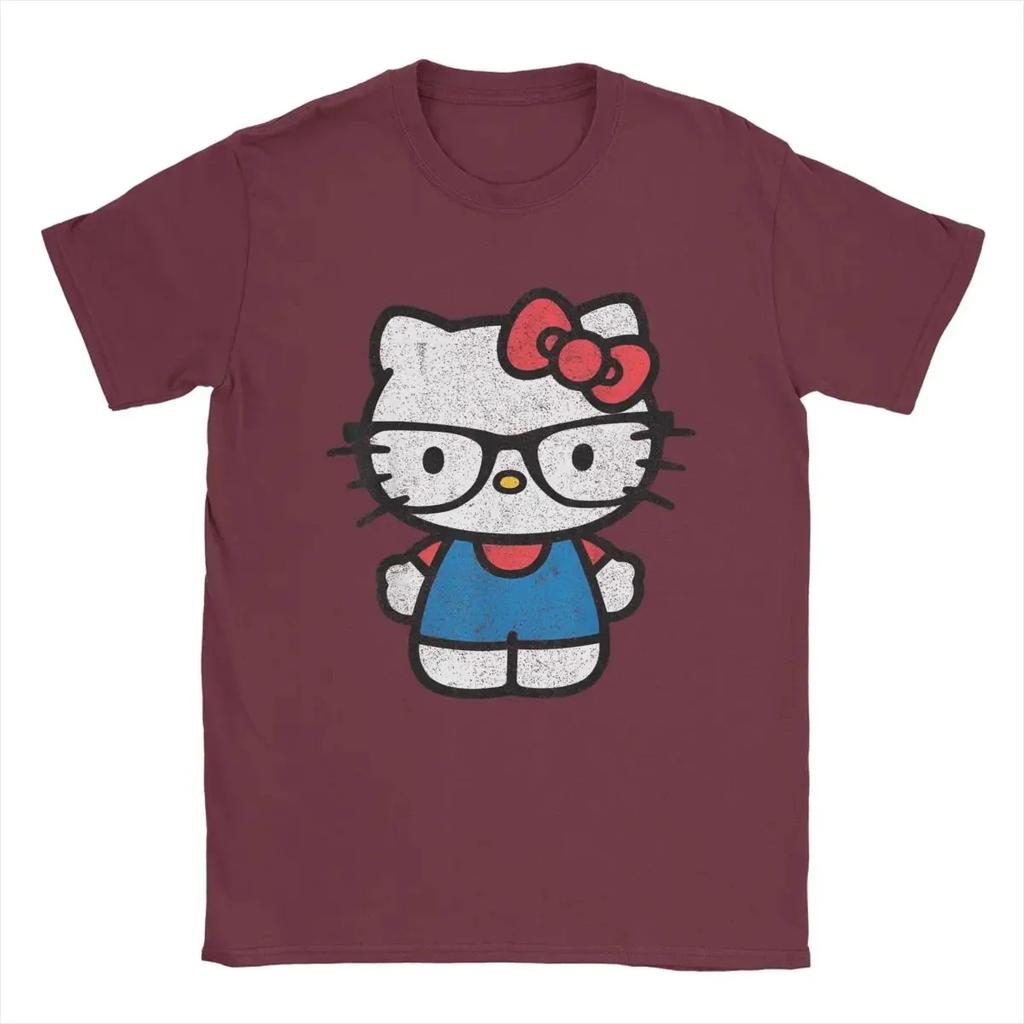 Hello Kitty Distressed Nerd Glasses T-Shirts for Men Novelty Pure Cotton Tees Crew Neck Short Sleeve T Shirt Clothes#Color(2)
