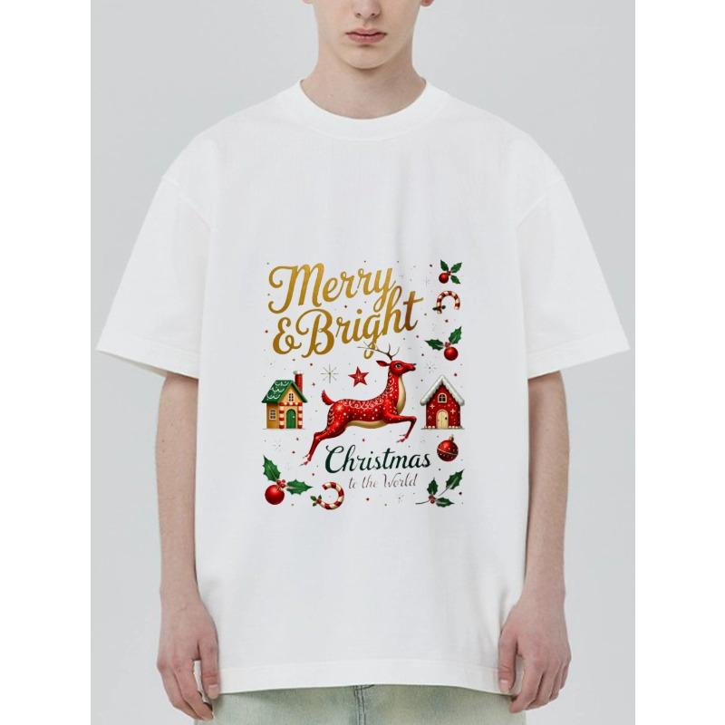 Christmas T Shirt Black Merry and Bright Reindeer House and Candy Cane Print for Holiday Party