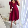 Summer 2025 Solid Color V-Neck Waist-Tie Bubble Sleeve Swing Dress for Commuting