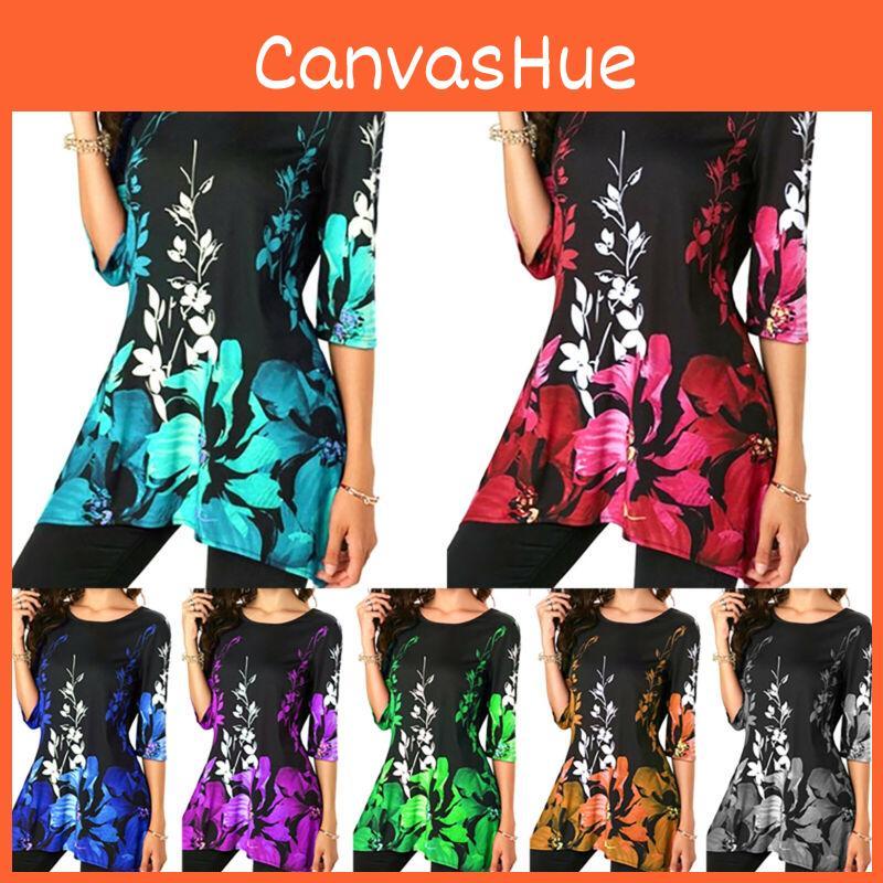 Plus Size Womens Asymmetric Floral Printed Short Sleeve Tunic Blouse For Summer Comfort