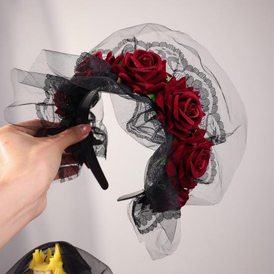 Yousheng Halloween Rose Flower Headband for Women Gothic Black Lace Red Rose Hairbands Lolita Lace Headwear for Masquerade Cosplay Party Hair