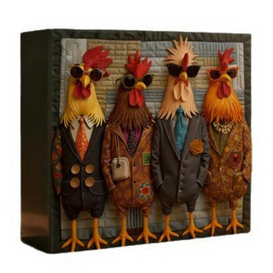The unique design showcases four personified roosters dressed in stylish suits and sunglasses, blending humor, retro charm, and modern fashion.