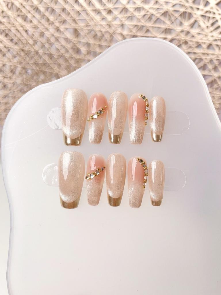 Crafted with exquisite attention to detail, these nails are perfect for any occasion, be it a gentle holiday celebration or a glamorous night out. The hand-painted designs feature a captivating cat-eye effect that will make your nails sparkle and shine like never before.