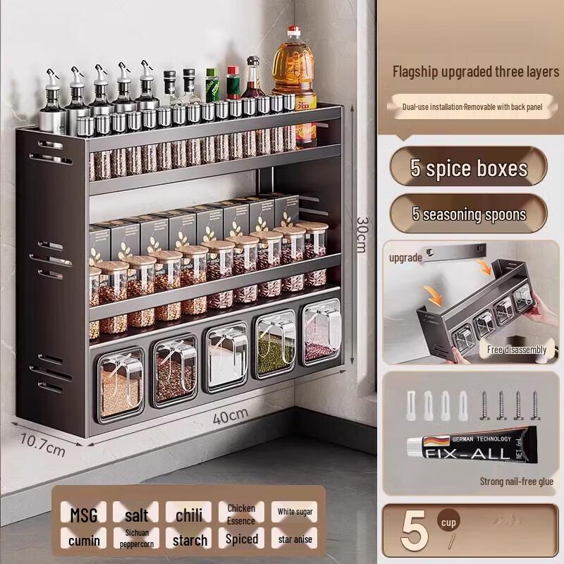 Beifu 3-Tier Carbon Steel Kitchen Spice Rack with 5 Jars & Spoons