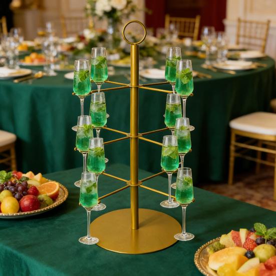 Crafted from high-quality steel, this sturdy and durable holder resists bending, deformation, and fading, ensuring long-lasting use without odor. Its sleek finish and stable tree-shaped design stand 22 inches tall with a 10-inch diameter, featuring three layers that hold 12 glasses securely—perfect for weddings, corporate events, holiday parties, or everyday entertaining.