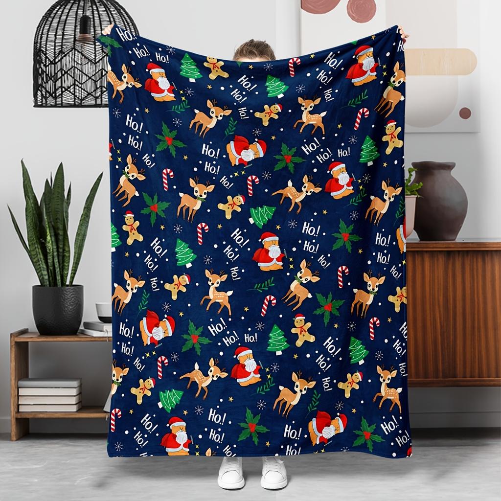 1 Christmas-themed Blanket Decorated with Santa Claus Reindeer Gingerbread Men and Candy Cane Patterns In Navy Blue