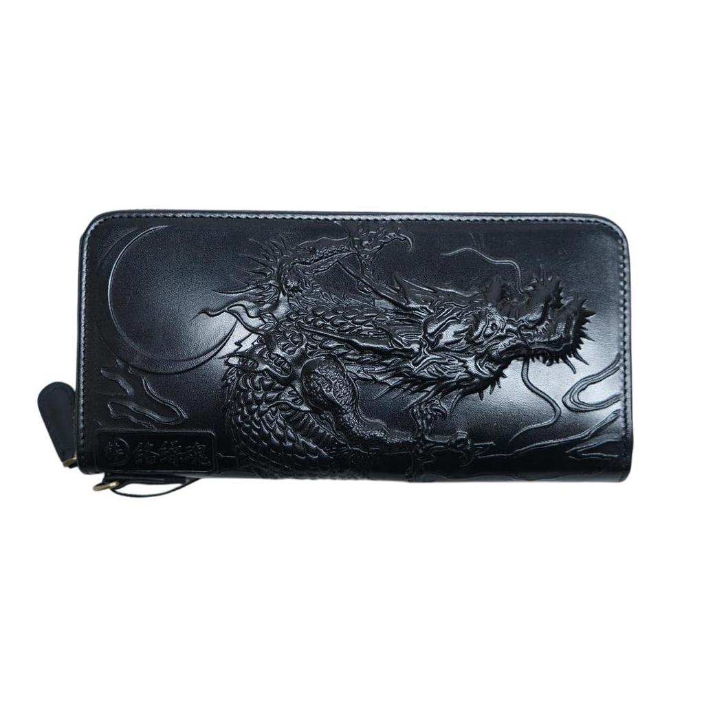 Karakuridamashii Leather Long Wallet, Japanese Pattern, Dragon, Genuine Cowhide Leather, Embossed, Stylish, 252852, Black, Size 20, Free