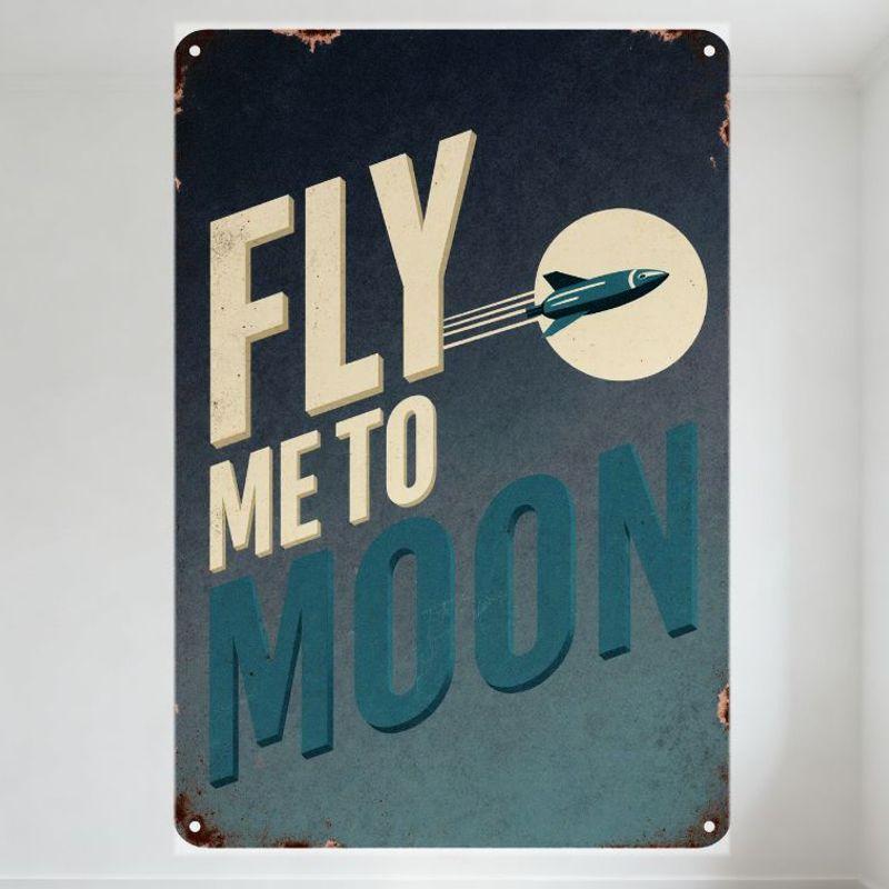 Vintage Space Age Metal Tin Sign, Rusty Retro 'Fly Me To Moon' Design with Rocket & Moon, Nostalgic Wall Art for Man Cave Bar Ho