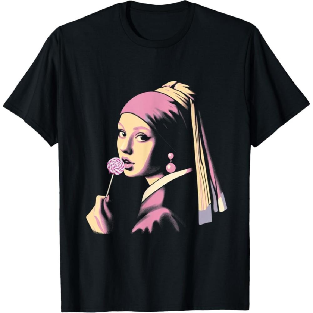 Funny Art Girl with a Pearl Earring Holding a Lollipop T-Shirt
