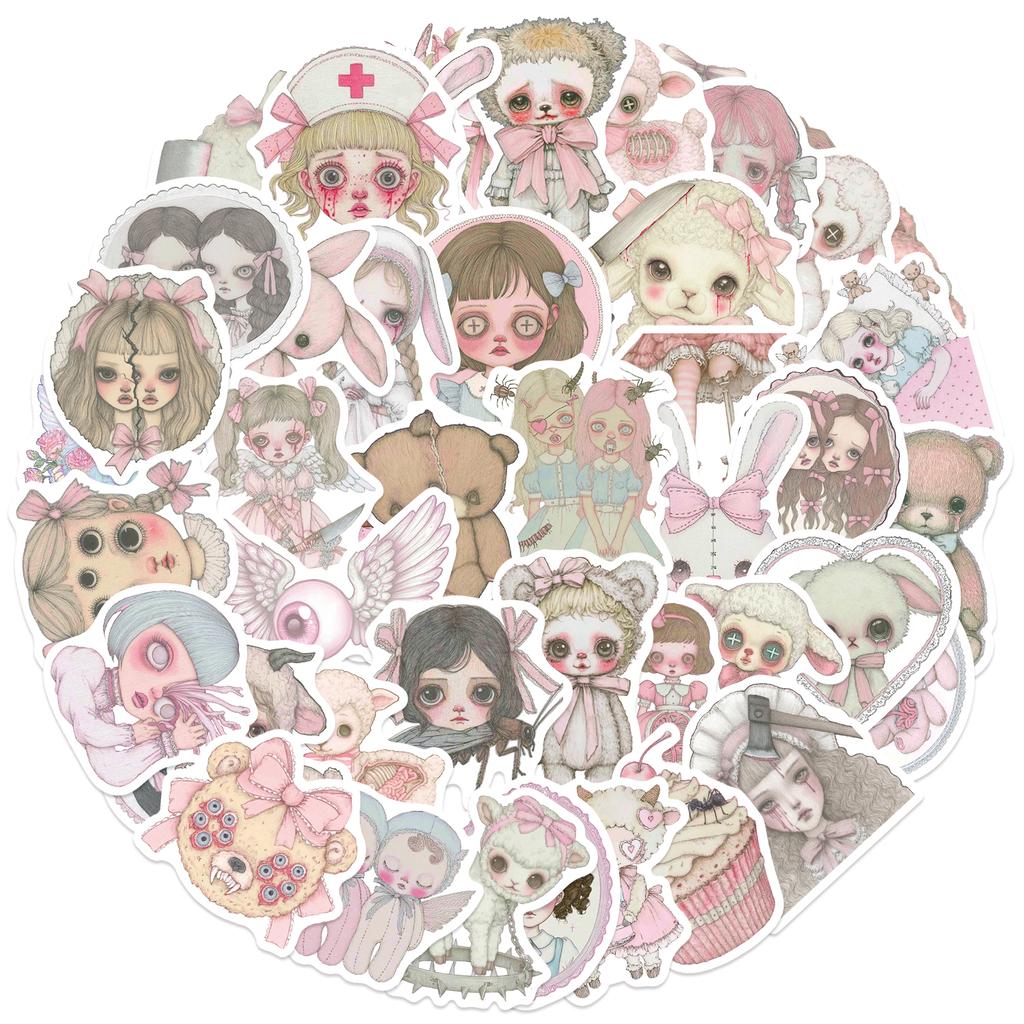 50PCS Pink Creepy Girl Stickers Cute Cartoon Doodles Decorative Stickers for Cups, Notebooks, Phones, and Luggage