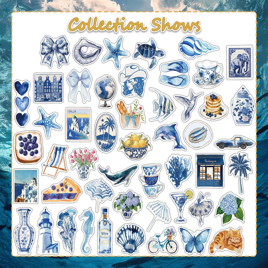 50pcs Blue Style Watercolor Aesthetics Graffiti Stickers Phone Guitar Laptop Notebook Suitcase Cup Waterproof Sticker Kids Toys