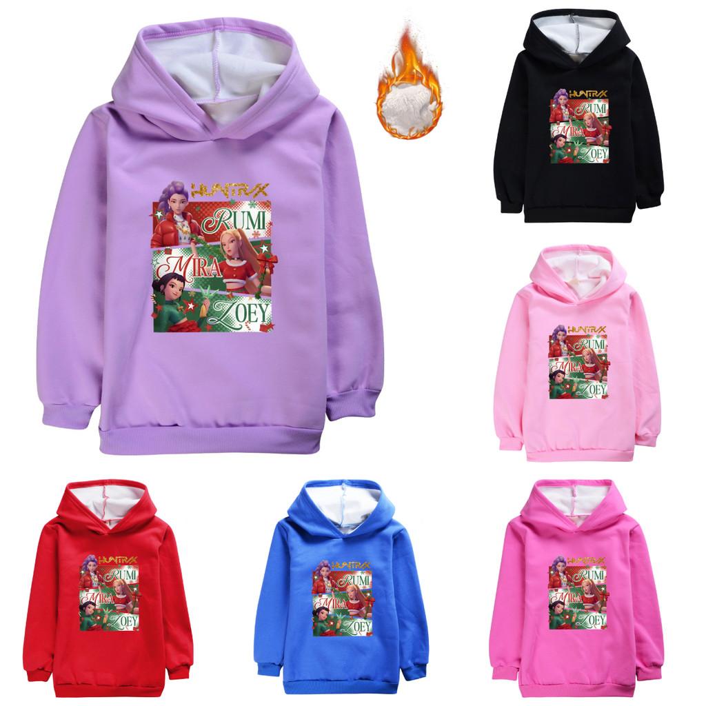 5181 Kids Girls Christmas New Year Kpop Rumi Zoey Mira Print Casual Long Sleeves Velvet Warm Winter Hoodie