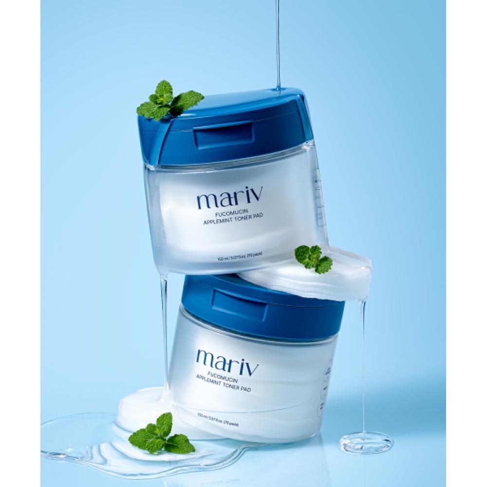 The MARIV Fucomucin Apple Mint Toner Pad Set (2 pieces) contains clean seaweed ingredients and apple mint that provide hydration and soothing effects to the skin. Suitable for sensitive and dry skin, this product can be conveniently used daily to refresh and moisturize the skin.