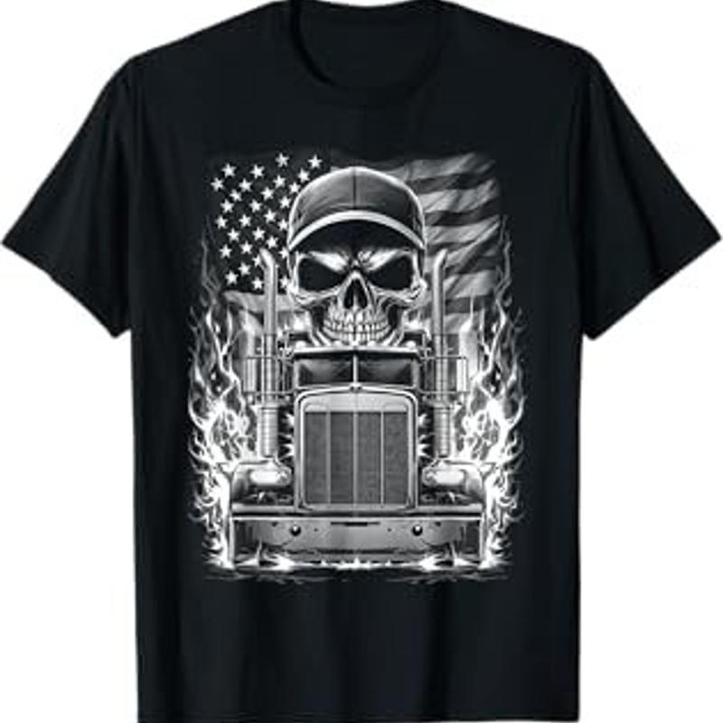 Trucker Patriotic American Flag Semi Truck Driver Skull T Shirt