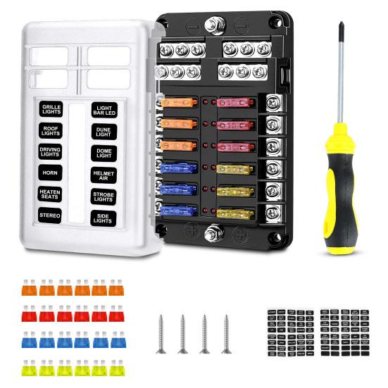 Safe Fuse Box: 12-way fuse box is manufactured from PBT for mechanically strong, insulated, inflaming retarding, high and low temperature resistant performance. This fuse box meets all the standards of an ideal fuse box, which is hardly lead to break, deformation, combustion or short-circuit. All busbars and fuse clips are made of nickel-clad copper for corrosion resistance and excellent electrical conductivity.