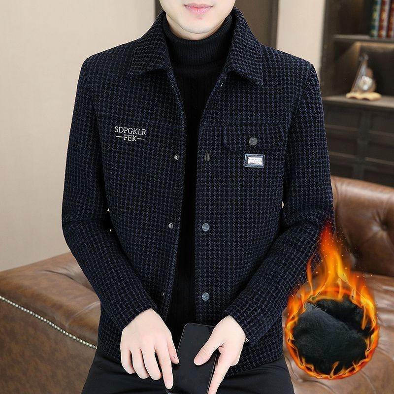 Winter Men's Fleece and Thickened Warm Woolen Coat, Casual, Versatile and Stylish Thousand-bird Check Woolen Jacket
