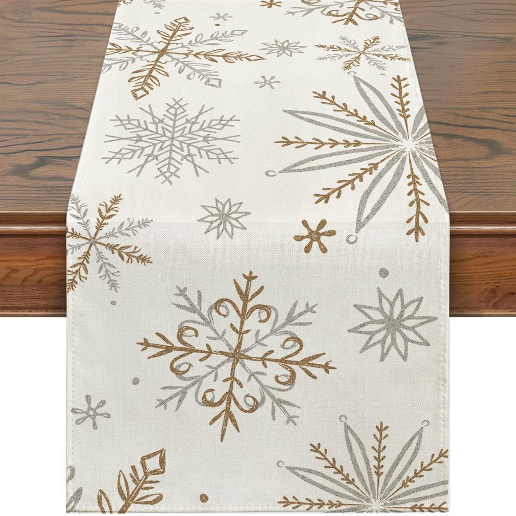 Winter Table Runner,Snowflake Decor, White, Gold, Table For Table, Seasonal, Christmas, Holiday, Home Decor
