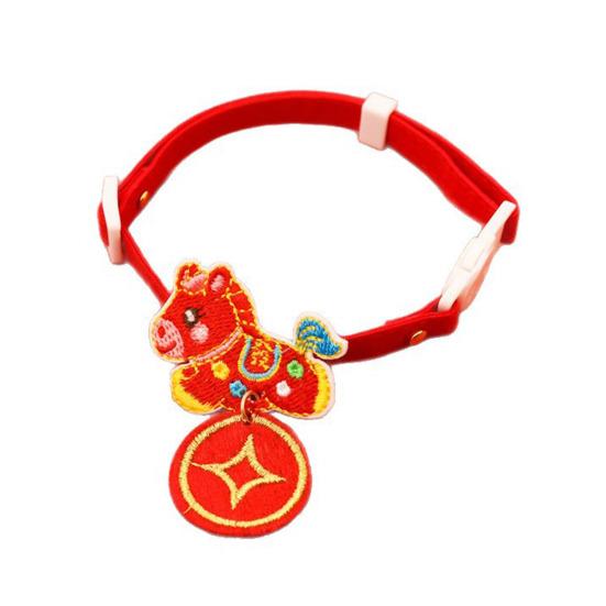 This adjustable pet collar is designed to fit kittens, puppies, and small to medium-sized pets comfortably with its buckle and length adjustment feature. Made from soft, skin-friendly polyester, it ensures no irritation or scratching, allowing your pet to wear it all day without discomfort. The collar features vibrant embroidered decorations such as lucky cats and zodiac ponies, adding a festive touch perfect for the Spring Festival or New Year celebrations.