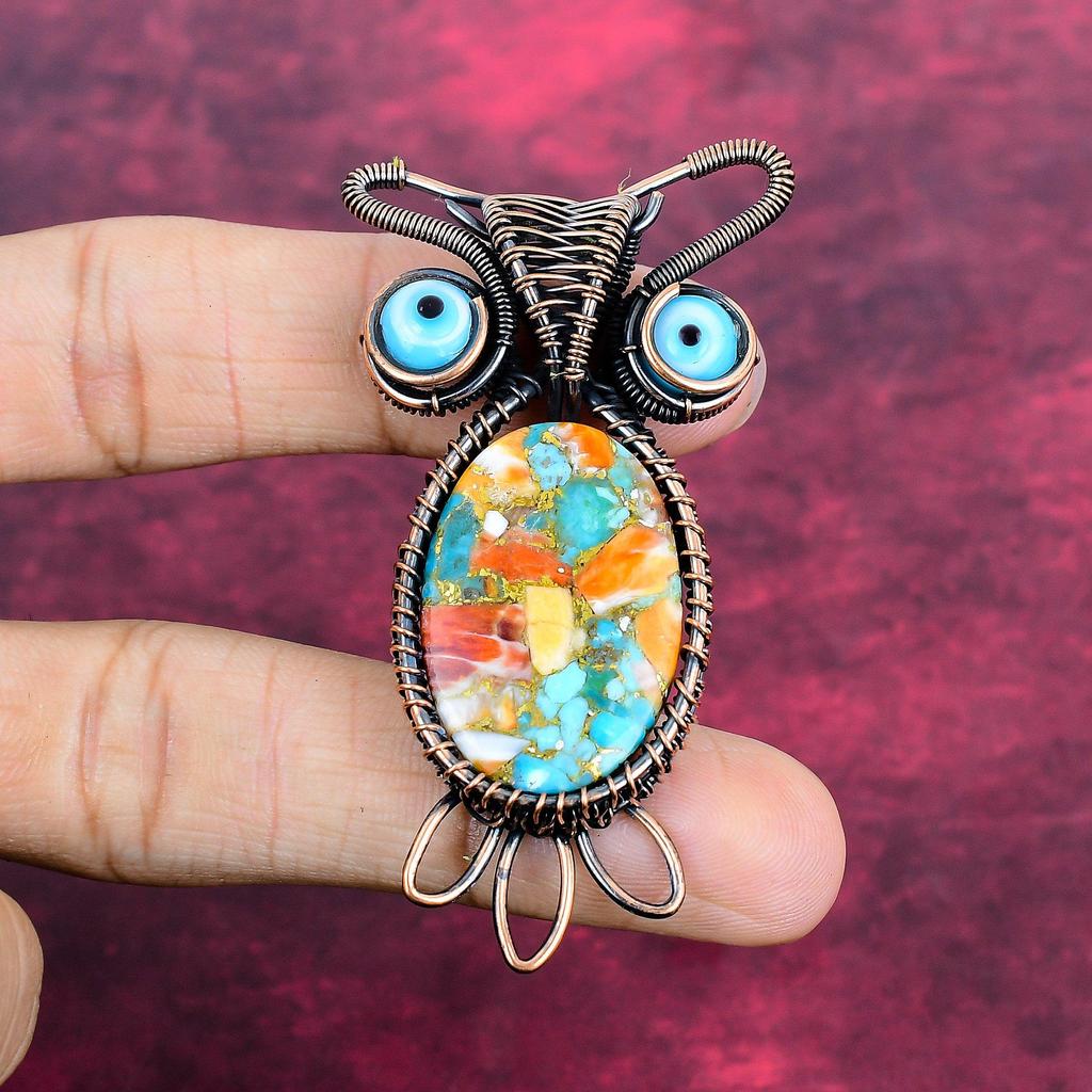 spiny oyster copper turquoise gemstone pendant copper wire wrapped pendant antique owl pendant blue color evil eye pendant handmade jewelry