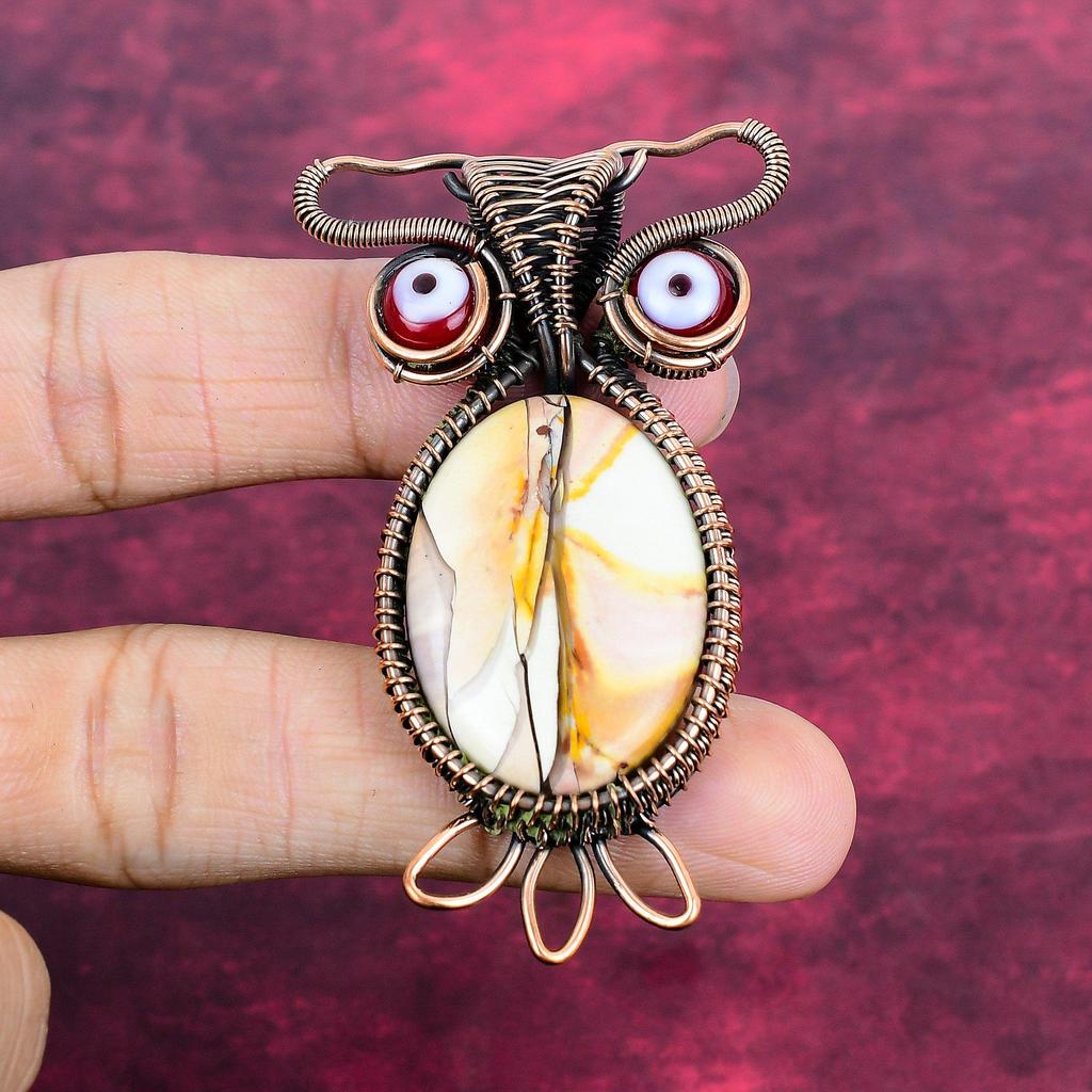 Brecciated Mookaite Gemstone Pendant Red Color Evil Eye Jewelry Copper Wire Wrapped Owl Pendant