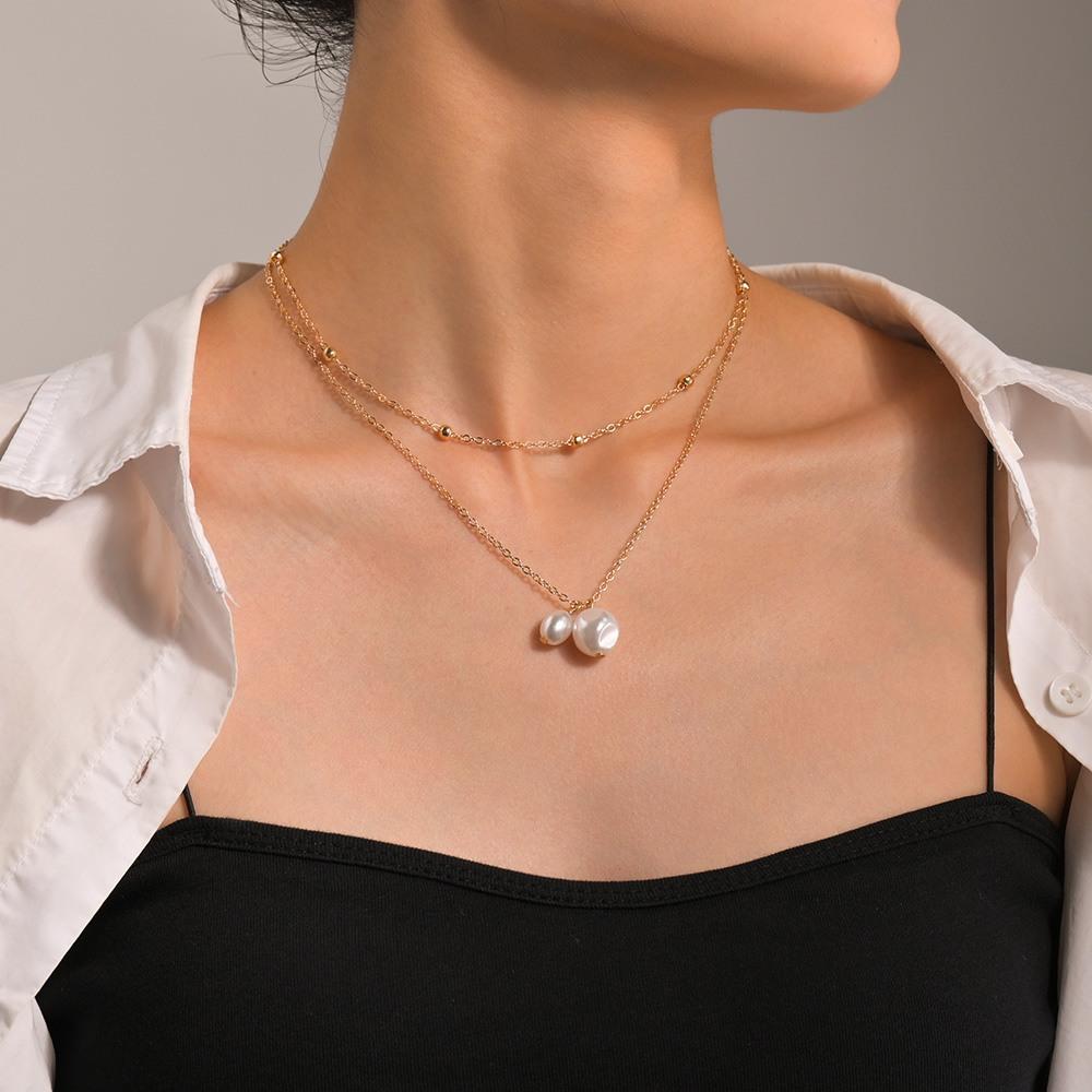 Personalized Ins Style, Simple Special-shaped Pearl Pendant, Double-layer Metal Women's Necklace.