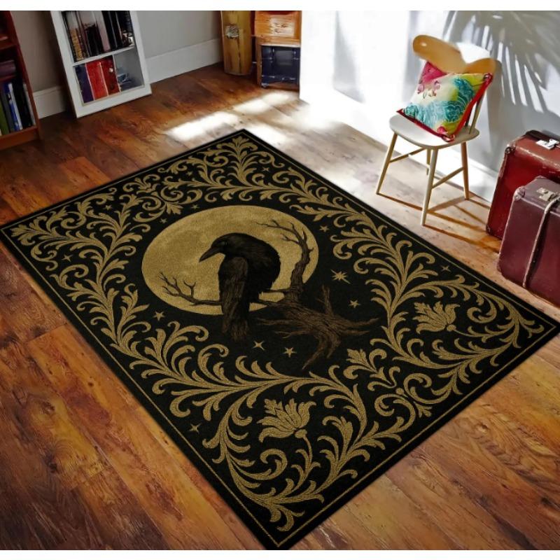 Raven Moon Gothic Rug Black Gold Baroque Rug Mysterious Crow Design for Elegant Dark Home Occult Decor Having Aesthetic Appeal
